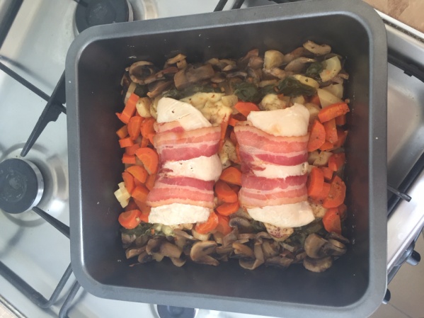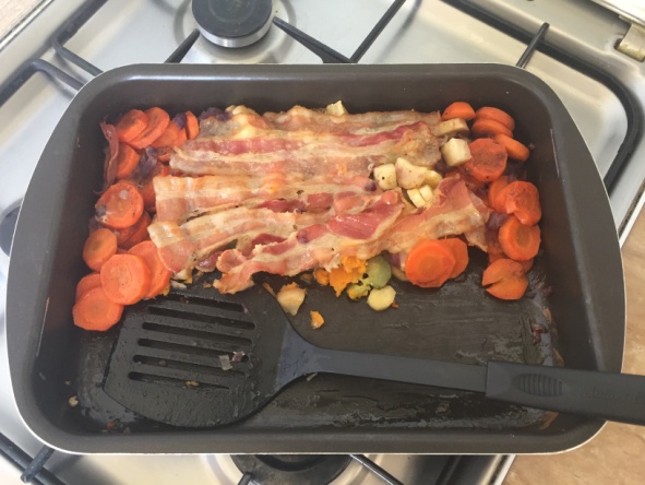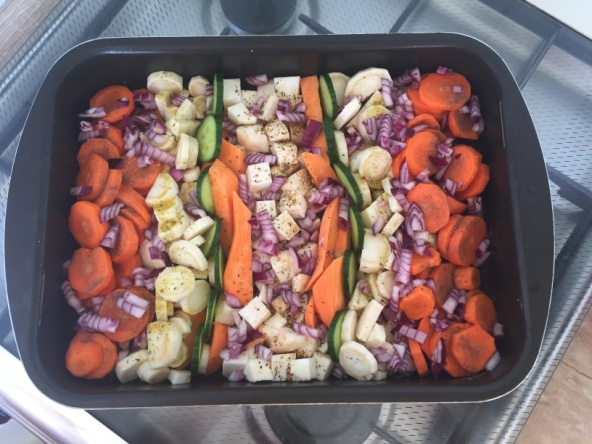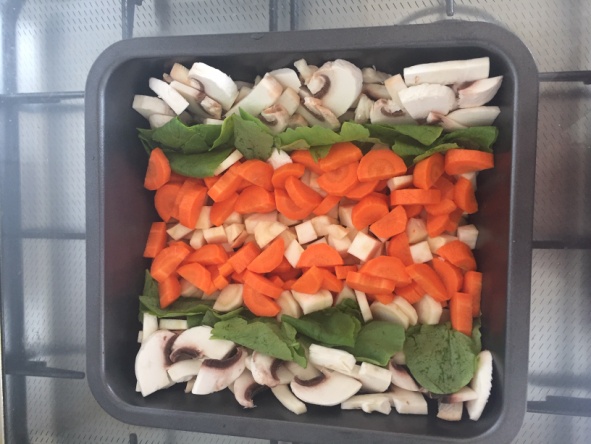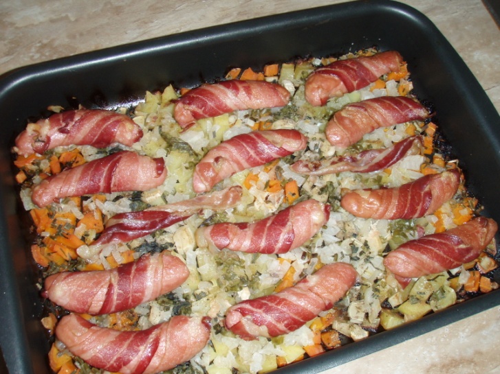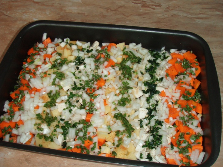 Teflon tepsiben elrendezzük a zöldségeket (sorokban, vagy összekeverve) és megszórjuk az apróra vágott vöröshagymával, valamint a választott fűszerekkel. (Hagyományos tepsiben is készíthető, de akkor ki kell zsírozni a tepsit mielőtt a zöldségeket betennénk.) Ráhelyezzük a szalonna szeleteket, ill. a húsfélét. Ha csak zöldséget sütünk, feltétlenül kell pár cseppnyi zsiradék a tetejére (spriccelt olaj, vagy morzsolt vaj). Alufóliával szorosan betakarjuk a tepsit és a 180 fokra beállított hideg sütőben kezdjük sütni. Félidőben (zöldségeknél 15-20 perc múlva, húsos feltétnél 30-35 perc múlva) levesszük a fóliát és úgy folytatjuk a sütést, amíg a nedvesség szinte teljesen elpárolog és a húsos feltét kicsit megpirul.